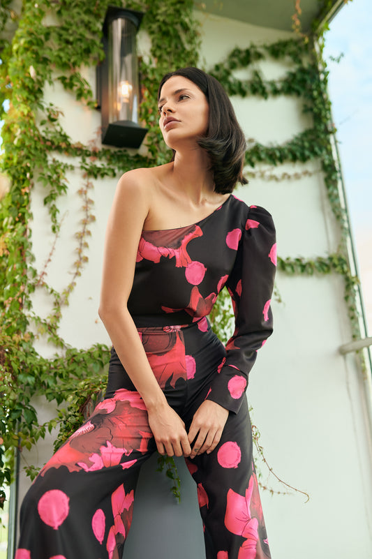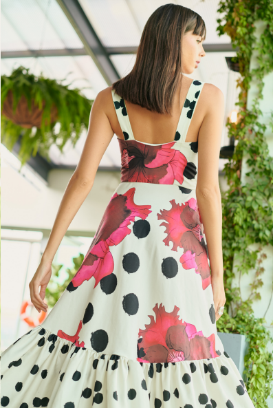 The collection highlights feel-good statement looks that go from dresses featuring voluminous shoulders, exaggerated ruffles, and pleated accents, to asymmetrical tops, flowy skirts, and wide-leg pants, captivating the ultra-feminine Latina essence. The brand’s signature cutouts are combined with sharp tailoring and plunging necklines to create bold and daring looks. Abstracted polka dots and blooming floral hand-painted prints are combined with solid pieces in black and burgundy with playful pops of bright pink and magenta, capturing the brand’s whimsical spirit.
